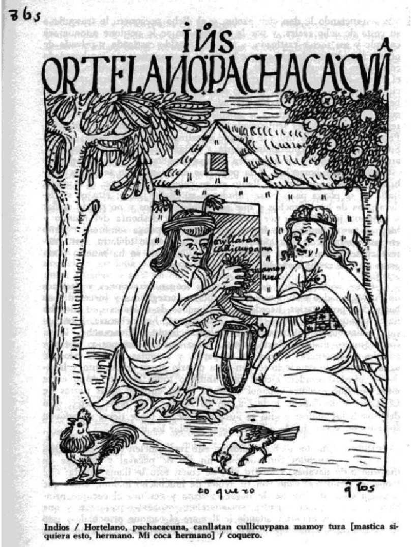 “Ortelano, Pachacacvna hortelanos”. Nueva corónica y buen gobierno (1615), p. 879. El anciano le dice en quechua: “Cayllata acullicuy, pana” Hermana, masca esta coca. La hortelana le responde: “Apomoy, tura” Tráela, hermano y extiende sus manos para recibirla.