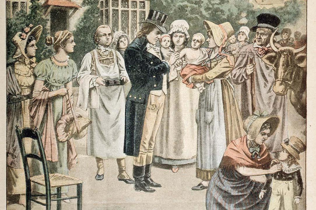 El investigador y médico inglés Edward Jenner (1749-1823) inmuniza a un niño contra la viruela utilizando un suero obtenido de viruela de vaca (ilustración publicada en 1901 en ‘Le Petit Journal’, París)