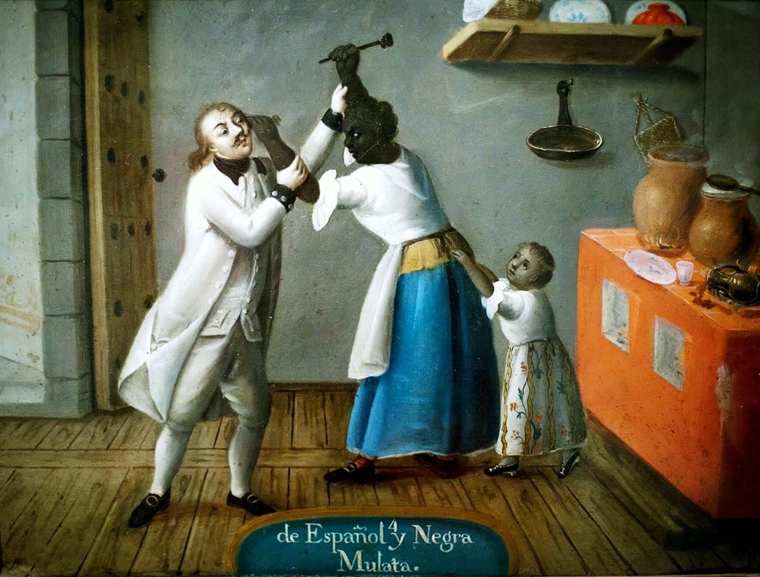 Pintura de Andrés de Islas. Casta 4: de español y negra nace mulata (siglo XVIII).